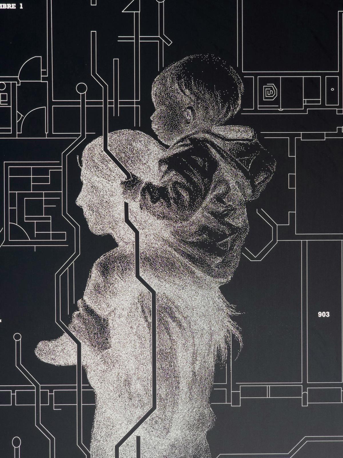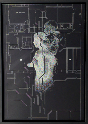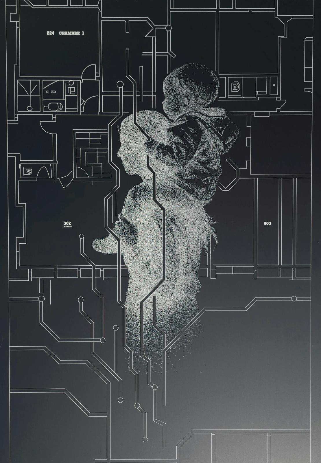 Laser engraving on anodised aluminium, executed from an original hand-drawn composition.